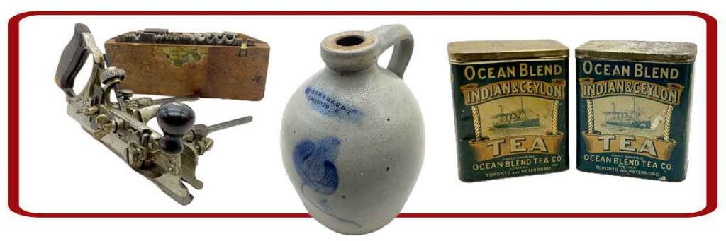 Quality offering to include a nice selection of early lighting including signed Pairpoint table lamp; Hummel bedroom lamps; blue flowered crocks; 28″ garden bronze by Toronto artist Al Green; gramophones including VV-300 console gramophone, Columbia cylinder gramophone with external brass horn; Victorian cranberry glass; Moorcroft pottery; Van Briggle art pottery vase; jardinieres; art pottery; Beswick and Doulton figurines; variety of antique furnishings including Gibbard tea wagon, small tables and smoke stands, walnut bedroom suite, Victorian spool cabinet, nesting tables, McCaskey oak register, rare antique oak payroll desk, vintage Sligh office desk, Singer 66 Red Eye sewing machine head; nice selection of antique tins; signs including 48″ metal Castrol Oil; variety of primitives and country decorating items; Oliver “Batwing” typewriter; antique child’s wagons; bisque head dolls; chrome hood ornaments; oak long case wall telephone; Persian rugs; original artwork and prints; railway lanterns; sterling silver and silverplate; quilts; Hudson’s bay blanket; wool blankets; signed boxes; Stanley 45 plane; and much more!